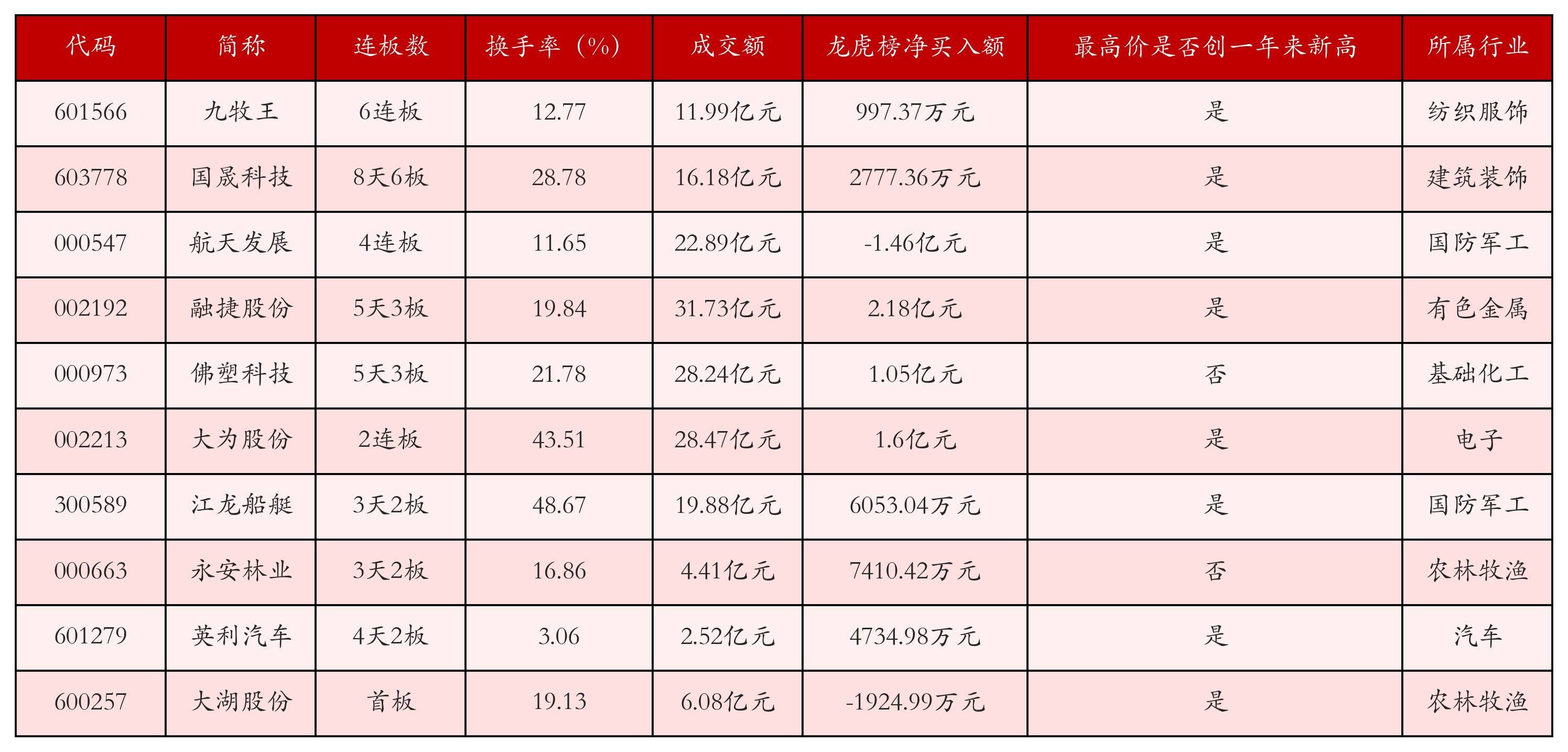 截至11月19日收盘,上证综指上涨0.18%,收于3946.74点,深证成指较前日不变,收于13080.09点,创业板指上涨0.25%,收于3076.85点。今日沪深两市A股共计65只涨停,综合当前连板数以及当日龙虎榜数据,其中较为强势的前三只个股分别为:九牧王(601566)、国晟科技(603778)与航天发展(000547)。今日强势个股前10位具体数据见下表: