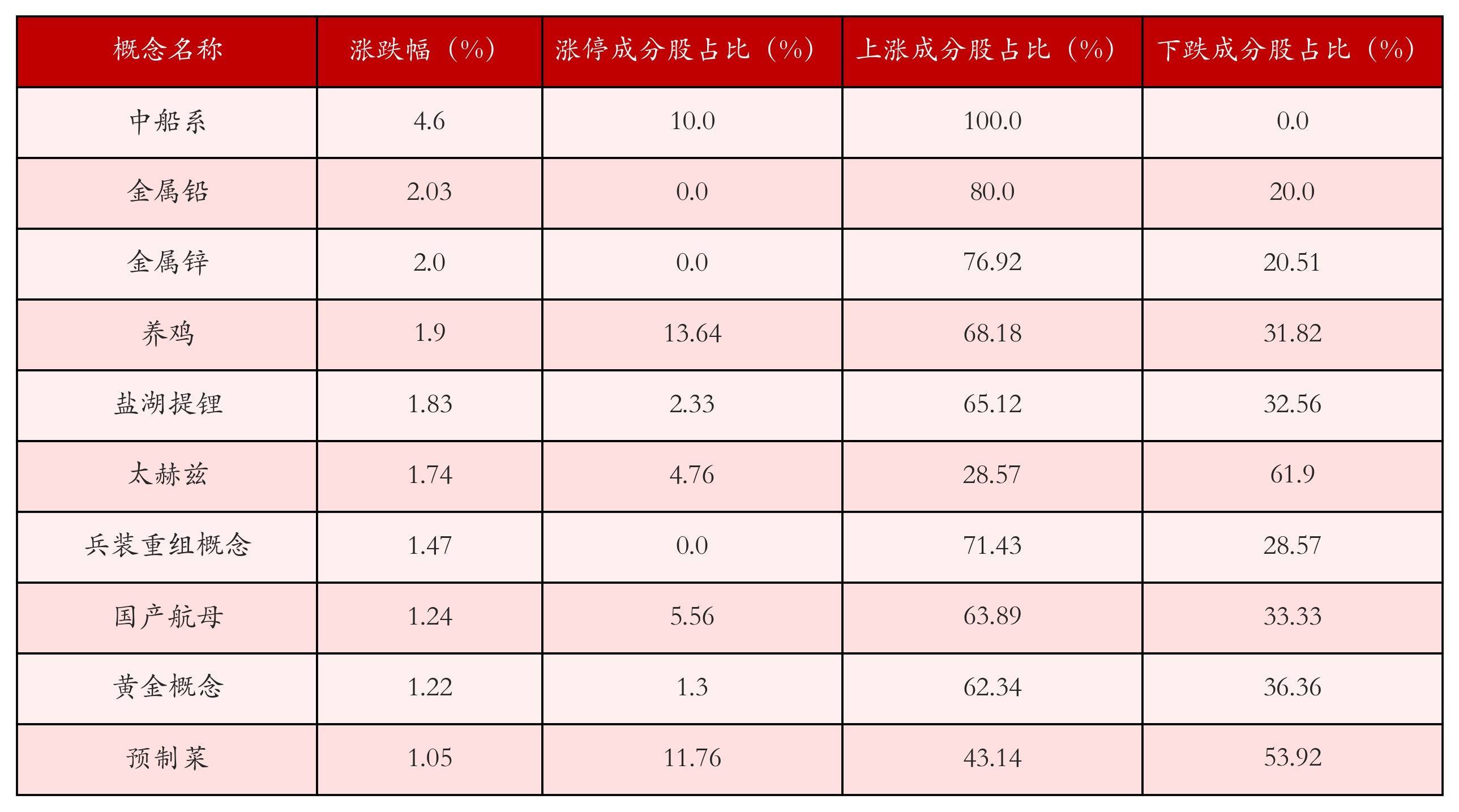 根据A股概念涨跌幅与所对应的股票池综合分析,涨幅靠前的三个概念板块分别为:中船系、金属铅与金属锌。排名前10位的概念板块相关数据见下表: